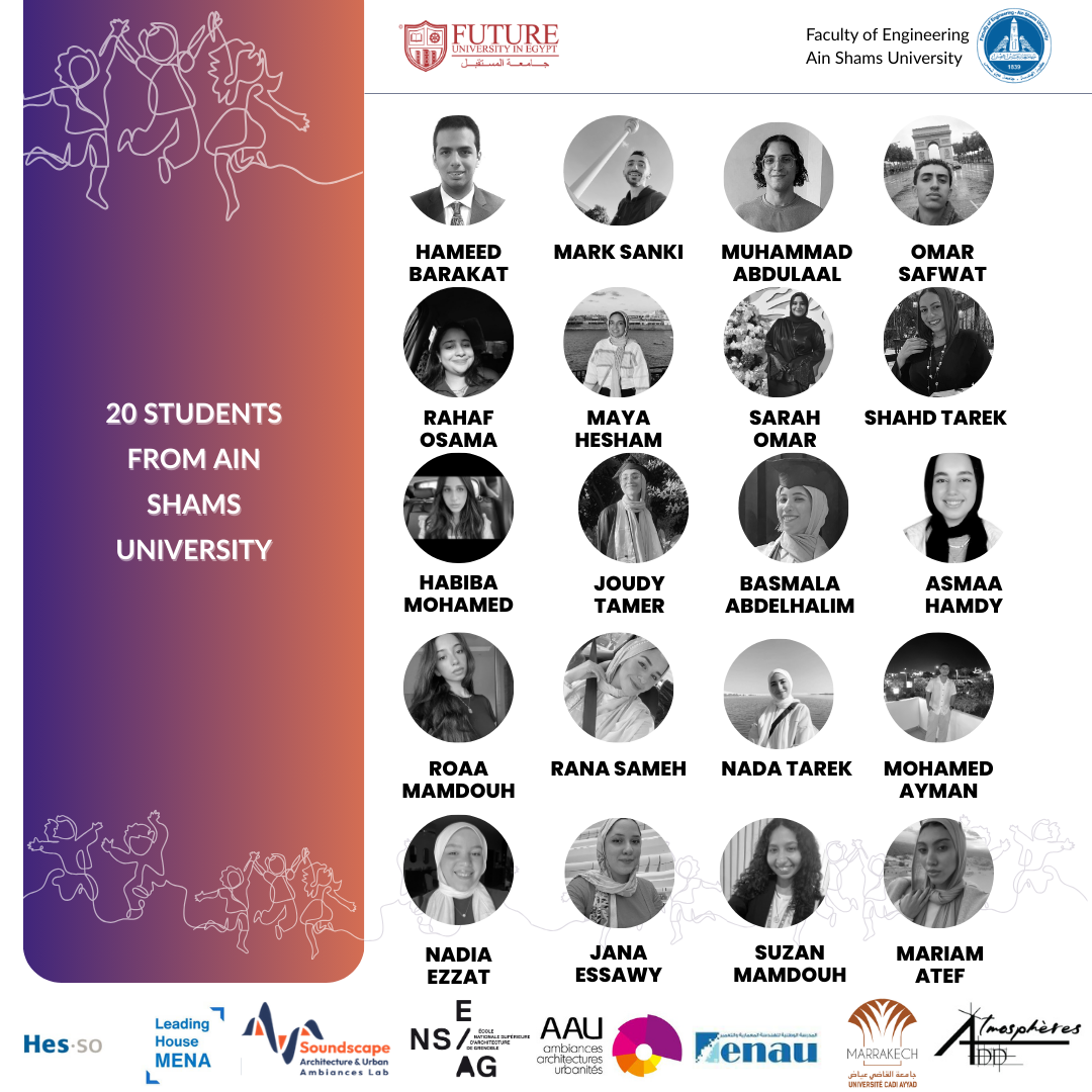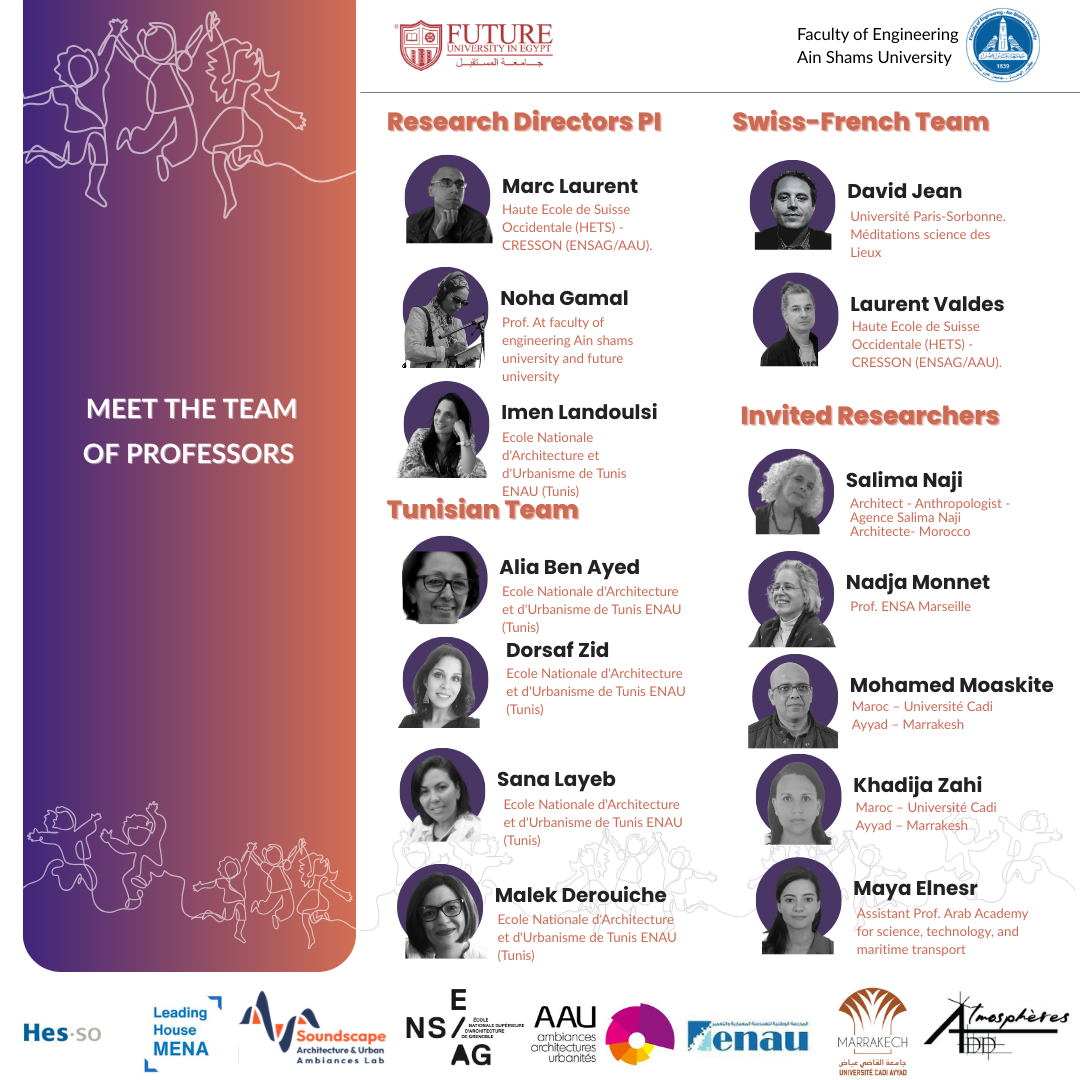 - المشاركون: أكثر من عشرة أساتذة وباحثين دوليين، وطلاب المدرسة القومية للهندسة المعمارية والعمران بتونس، وأعضاء هيئة التدريس والهيئة المعاونة والطلاب بجامعة المستقبل وكلية الهندسة جامعة عين شمس.